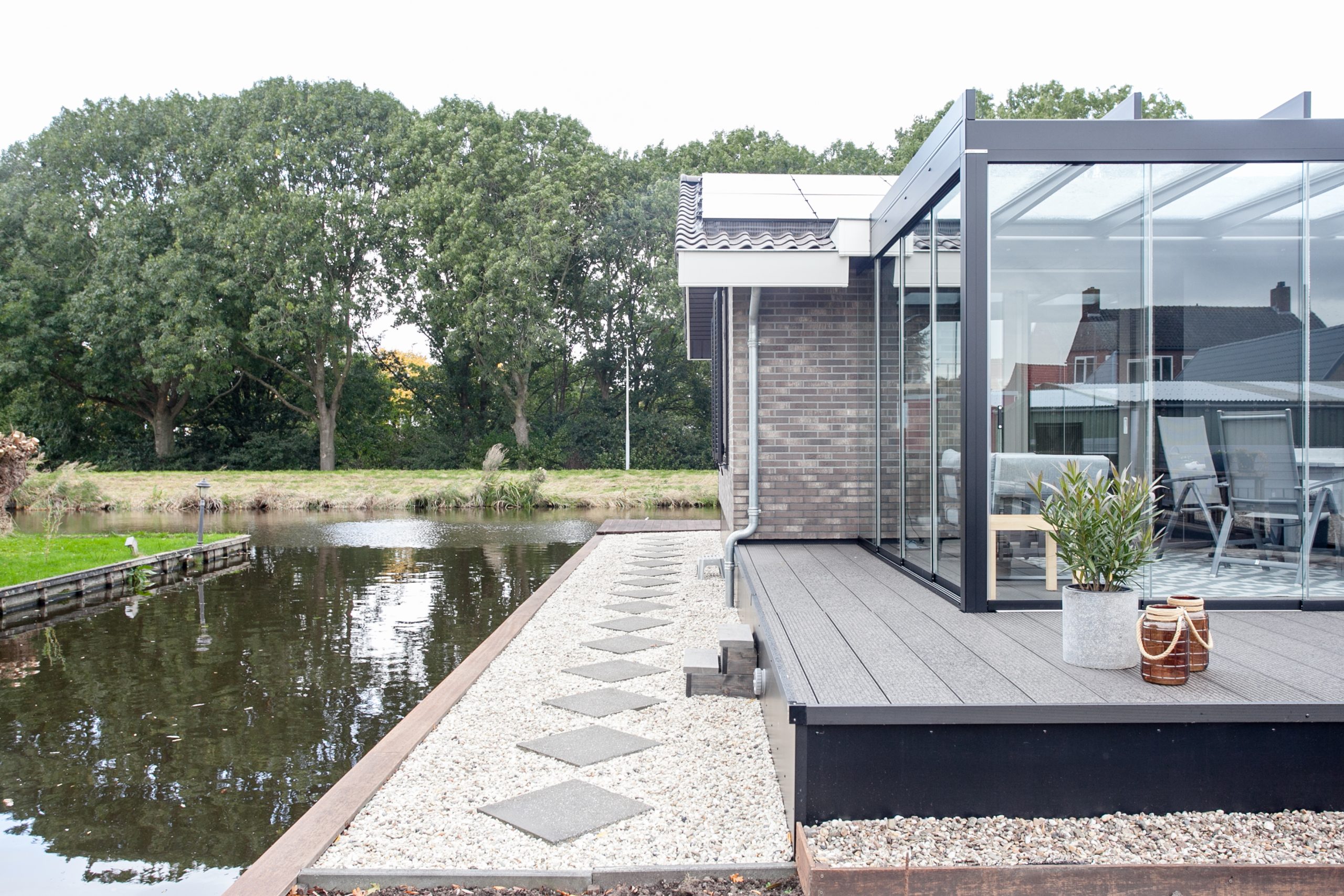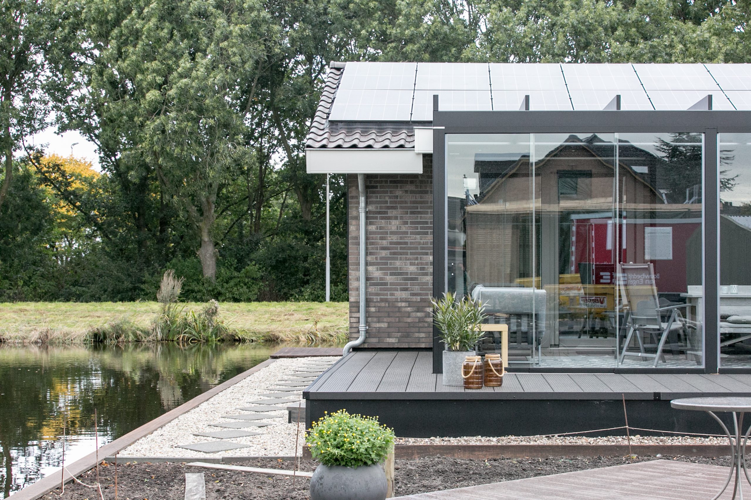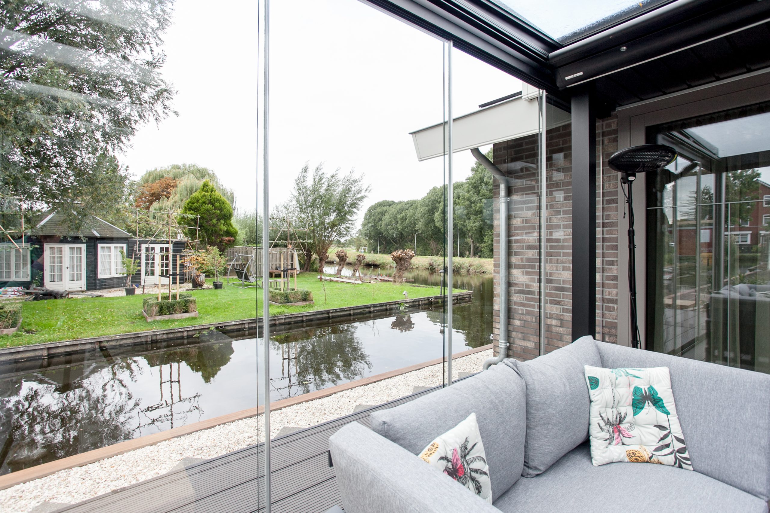 “Achter de hoofdwoning ligt een heel groot stuk grond. Ruimte genoeg dus om daar een mantelzorgwoning te realiseren. Het transport kon helaas niet over de te smalle Boterdijk plaatsvinden en moest dus via de Vuurlijn en via de Ringvaart over het water uitgevoerd worden. Superspannend, want je wil natuurlijk niet dat je hele woning in het water valt. Gelukkig heeft TOP Totaal veel ervaring met plaatsingen via het water, en na een uitgedacht plan is dit helemaal goed gekomen.”