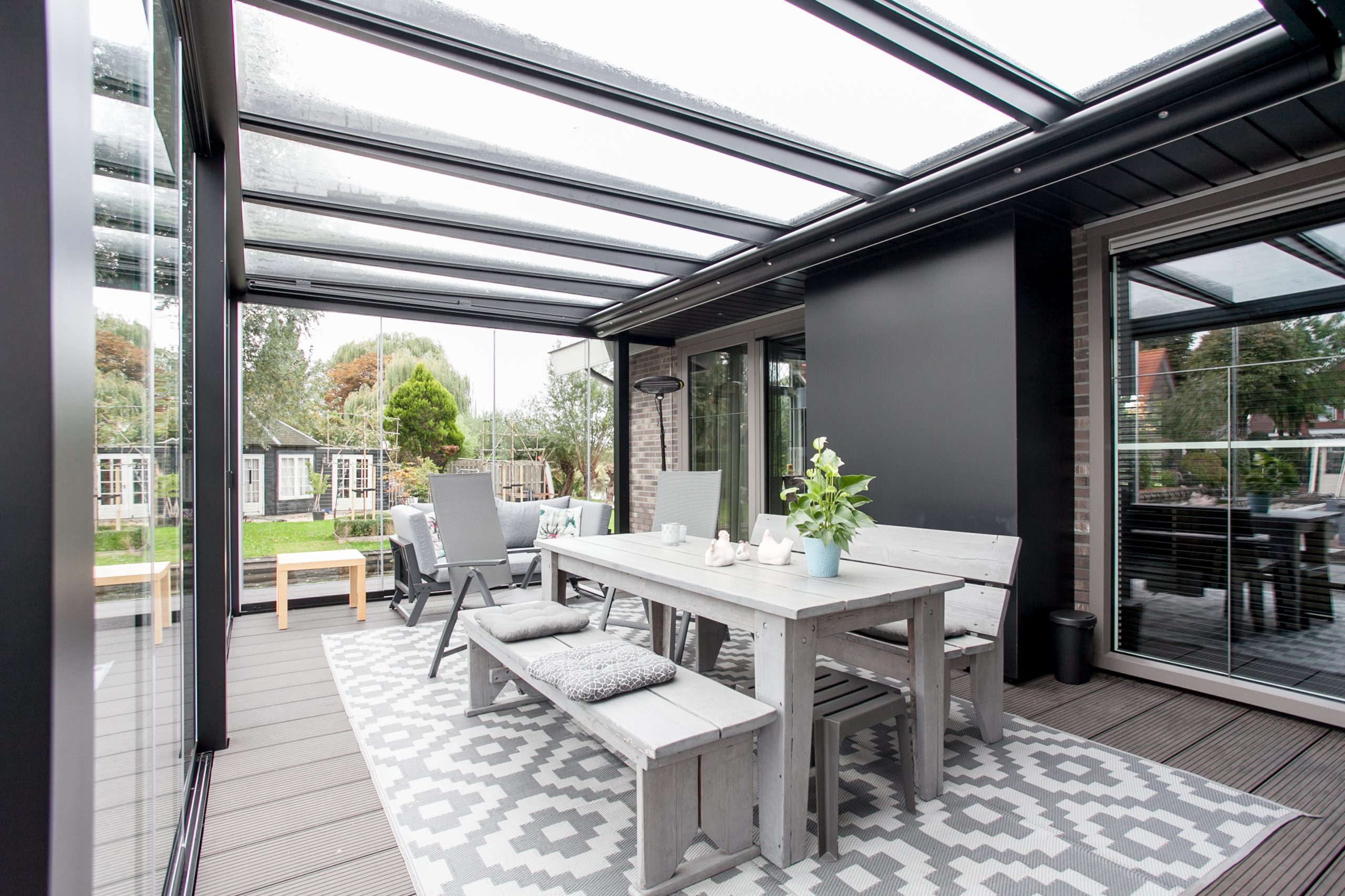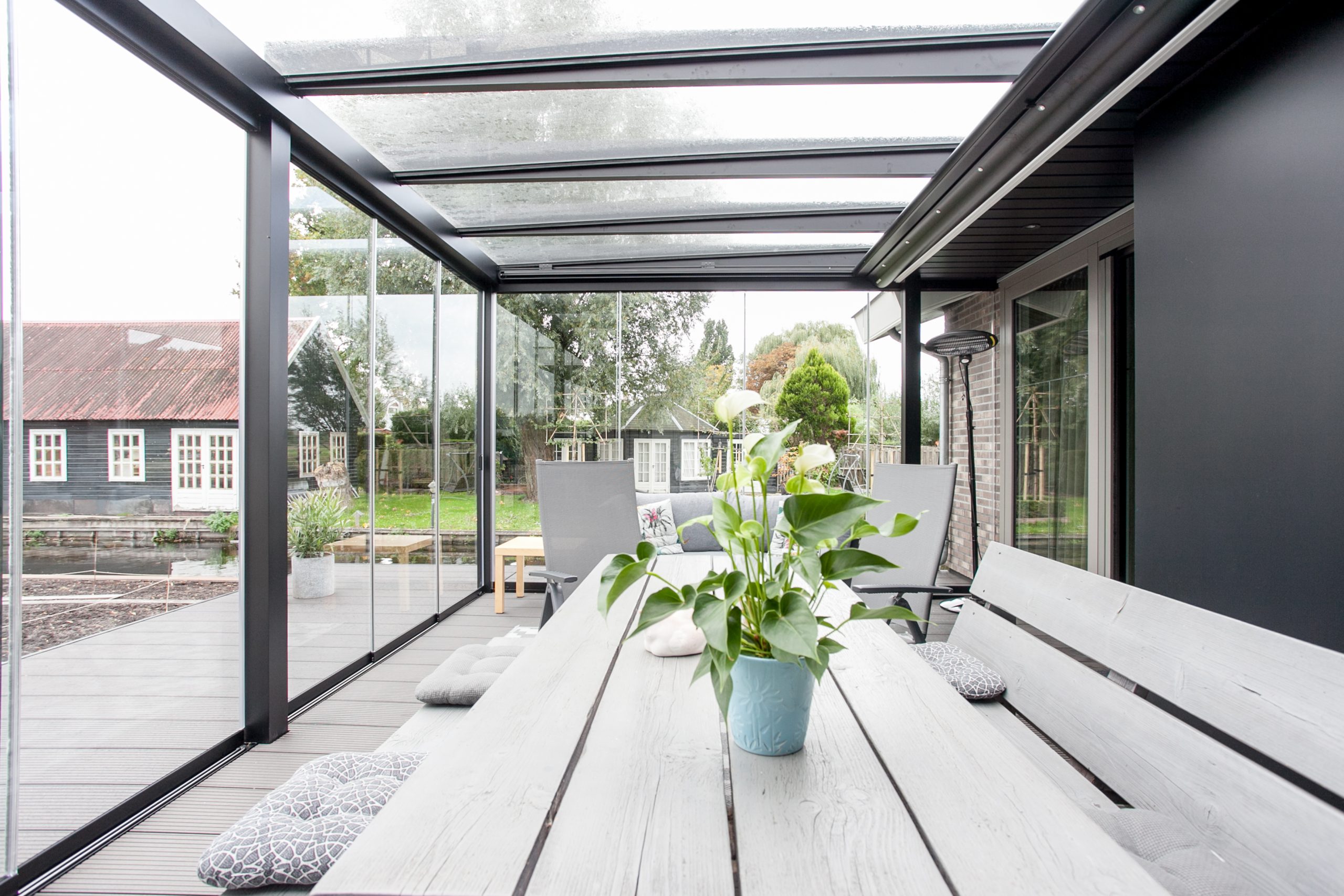 “We wonen op een royaal stuk grond, dat vroeger door mijn vader werd gebruikt als kwekerij. Naast de woning is voldoende ruimte voor onze camper, waarmee we gedurende het jaar veel door Europa reizen. De serre maakt onze woning helemaal af. Hier hebben we zo verschrikkelijk veel plezier van. We kunnen hem helemaal openzetten maar ook afsluiten, zodat je langer plezier beleeft aan het buitenleven.”