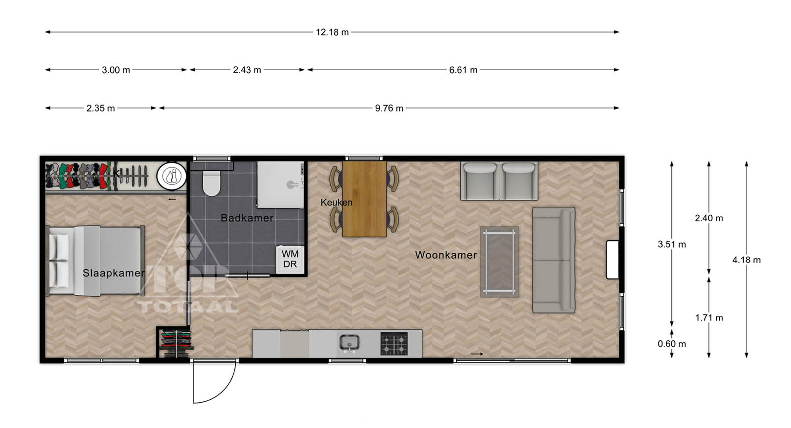 De woning is 12,5 meter lang en 4,5 meter breed.