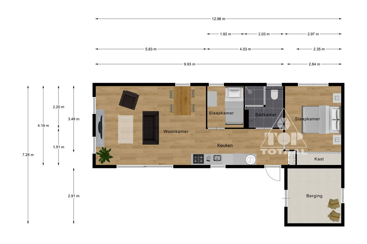 Deze sleutelklare mantelzorgwoning is verkocht. De totale oppervlakte is 70 m², inclusief 10 m² berging/schuur.
